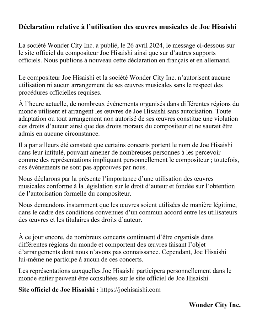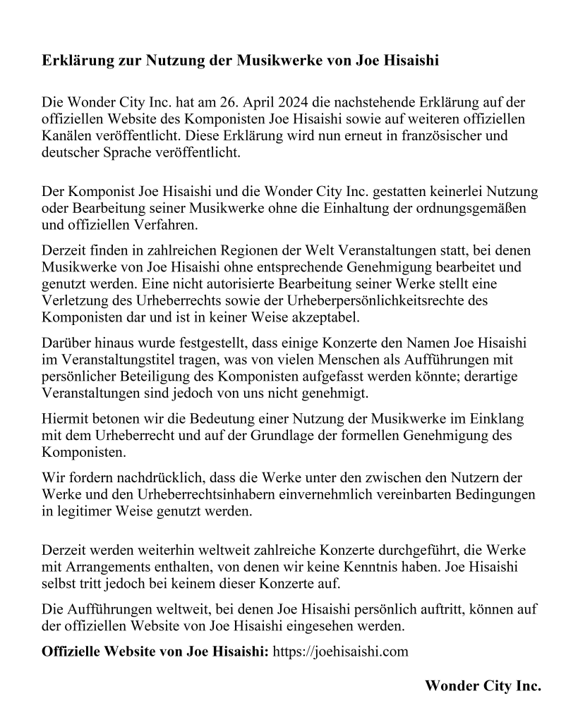 Wonder City Inc. published a statement regarding the use of Joe Hisaishi's musical works on April 26, 2024, on this website as well as on other official channels (https://joehisaishi.com/wp-content/uploads/2026/02/ENG.png). We are republishing this statement in French and German. To this day, many concerts continue to be organized in various regions around the world featuring works with arrangements of which we have no knowledge. However, Joe Hisaishi himself does not participate in any of these concerts. Performances in which Joe Hisaishi personally appears worldwide can be confirmed on the following page. https://joehisaishi.com/concert/ ----- French ---------------- Déclaration relative à l’utilisation des œuvres musicales de Joe Hisaishi La société Wonder City Inc. a publié, le 26 avril 2024, le message ci-dessous sur le site officiel du compositeur Joe Hisaishi ainsi que sur d’autres supports officiels. Nous publions à nouveau cette déclaration en français et en allemand. Le compositeur Joe Hisaishi et la société Wonder City Inc. n’autorisent aucune utilisation ni aucun arrangement de ses œuvres musicales sans le respect des procédures officielles requises. À l’heure actuelle, de nombreux événements organisés dans différentes régions du monde utilisent et arrangent les œuvres de Joe Hisaishi sans autorisation. Toute adaptation ou tout arrangement non autorisé de ses œuvres constitue une violation des droits d’auteur ainsi que des droits moraux du compositeur et ne saurait être admis en aucune circonstance. Il a par ailleurs été constaté que certains concerts portent le nom de Joe Hisaishi dans leur intitulé, pouvant amener de nombreuses personnes à les percevoir comme des représentations impliquant personnellement le compositeur ; toutefois, ces événements ne sont pas approuvés par nous. Nous déclarons par la présente l’importance d’une utilisation des œuvres musicales conforme à la législation sur le droit d’auteur et fondée sur l’obtention de l’autorisation formelle du compositeur. Nous demandons instamment que les œuvres soient utilisées de manière légitime, dans le cadre des conditions convenues d’un commun accord entre les utilisateurs des œuvres et les titulaires des droits d’auteur. À ce jour encore, de nombreux concerts continuent d’être organisés dans différentes régions du monde et comportent des œuvres faisant l’objet d’arrangements dont nous n’avons pas connaissance. Cependant, Joe Hisaishi lui-même ne participe à aucun de ces concerts. Les représentations auxquelles Joe Hisaishi participera personnellement dans le monde entier peuvent être consultées sur le site officiel de Joe Hisaishi. Site officiel de Joe Hisaishi : https://joehisaishi.com ----- German ---------------- Erklärung zur Nutzung der Musikwerke von Joe Hisaishi Die Wonder City Inc. hat am 26. April 2024 die nachstehende Erklärung auf der offiziellen Website des Komponisten Joe Hisaishi sowie auf weiteren offiziellen Kanälen veröffentlicht. Diese Erklärung wird nun erneut in französischer und deutscher Sprache veröffentlicht. Der Komponist Joe Hisaishi und die Wonder City Inc. gestatten keinerlei Nutzung oder Bearbeitung seiner Musikwerke ohne die Einhaltung der ordnungsgemäßen und offiziellen Verfahren. Derzeit finden in zahlreichen Regionen der Welt Veranstaltungen statt, bei denen Musikwerke von Joe Hisaishi ohne entsprechende Genehmigung bearbeitet und genutzt werden. Eine nicht autorisierte Bearbeitung seiner Werke stellt eine Verletzung des Urheberrechts sowie der Urheberpersönlichkeitsrechte des Komponisten dar und ist in keiner Weise akzeptabel. Darüber hinaus wurde festgestellt, dass einige Konzerte den Namen Joe Hisaishi im Veranstaltungstitel tragen, was von vielen Menschen als Aufführungen mit persönlicher Beteiligung des Komponisten aufgefasst werden könnte; derartige Veranstaltungen sind jedoch von uns nicht genehmigt. Hiermit betonen wir die Bedeutung einer Nutzung der Musikwerke im Einklang mit dem Urheberrecht und auf der Grundlage der formellen Genehmigung des Komponisten. Wir fordern nachdrücklich, dass die Werke unter den zwischen den Nutzern der Werke und den Urheberrechtsinhabern einvernehmlich vereinbarten Bedingungen in legitimer Weise genutzt werden. Derzeit werden weiterhin weltweit zahlreiche Konzerte durchgeführt, die Werke mit Arrangements enthalten, von denen wir keine Kenntnis haben. Joe Hisaishi selbst tritt jedoch bei keinem dieser Konzerte auf. Die Aufführungen weltweit, bei denen Joe Hisaishi persönlich auftritt, können auf der offiziellen Website von Joe Hisaishi eingesehen werden. Offizielle Website von Joe Hisaishi: https://joehisaishi.com ----------------------------- -