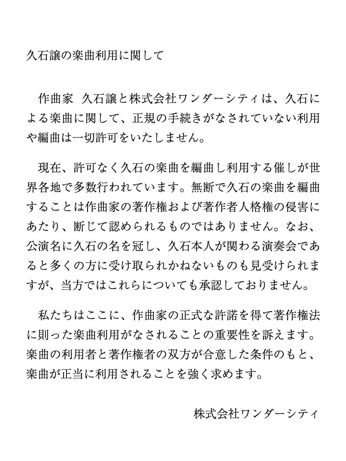 株式会社ワンダーシティは、2024年4月26日、当ウェブサイト等において久石譲の楽曲利用に関する投稿を行っておりますが、改めてフランス語及びドイツ語に翻訳したものを投稿致します。